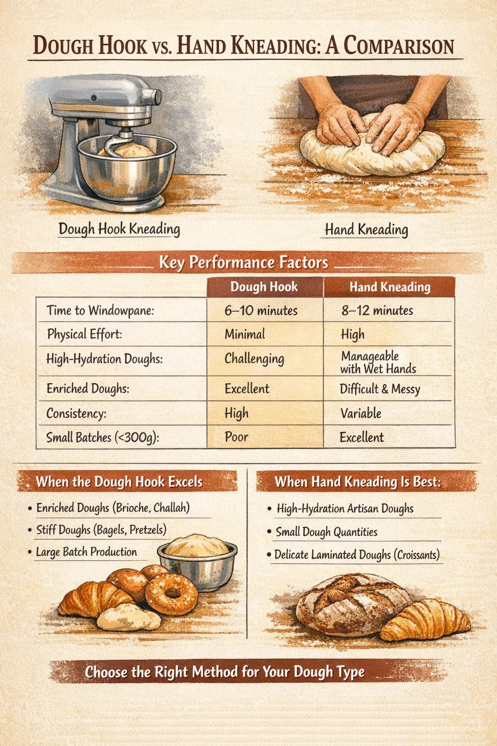 두 방법 모두 훌륭한 빵을 생산할 수 있습니다. 차이점은 제어, 시간, 노력 및 작업 중인 반죽의 특정 요구 사항에 따라 결정됩니다.