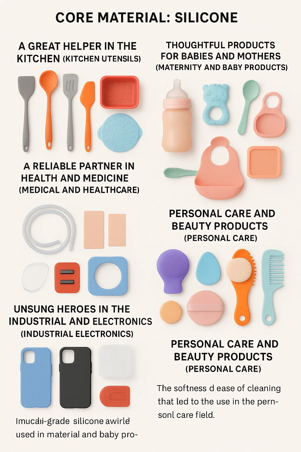 실리콘 제품 실리콘이라는 특수 소재로 제작된 다양한 아이템입니다. 전자제품에 사용되는 '실리콘'과는 다릅니다. 실리콘 제품의 분류는 다음과 같습니다.